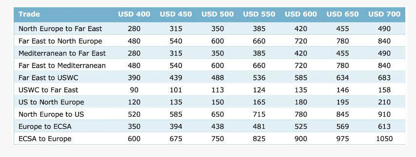 马士基部分航线在不同燃油价格(美元/吨)对应下的BAF(美元/FFE)