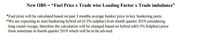 其中,燃油价格将以过去三个月主要加油港的平均燃油价格为准。同时,由于ONE预计从2019年第四季度起使用混合燃料油(0.5% sulphur),届时将以混合燃料油价格计算OBS。
