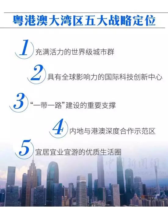 中央对粤港澳大湾区的战略定位有五个:一是充满活力的世界级城市群;二是具有全球影响力的国际科技创新中心;三是“一带一路”建设的重要支撑;四是内地与港澳深度合作示范区;五是宜居宜业宜游的优质生活圈。