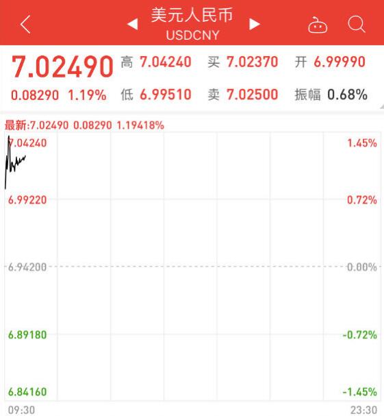 今天8月5日上午九点十六分左右,离岸美元兑人民币跌破7关口,最高报7.1057。到了9点32分左右,在岸人民币兑美元汇率也跌破7关口,最高报7.0424。