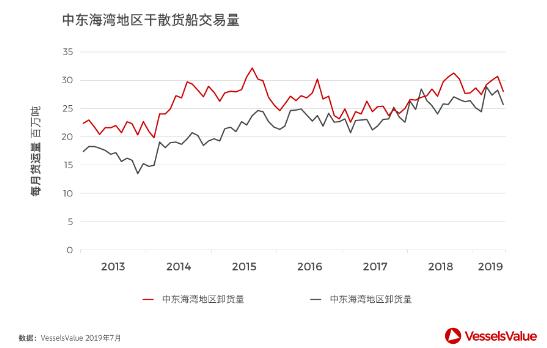中东海湾地区的干散货船、集装箱船和滚装船的贸易与全球贸易相比并没有那么重要。按重量计算,该地区的干散货船出口量约占全球出口量的3%。