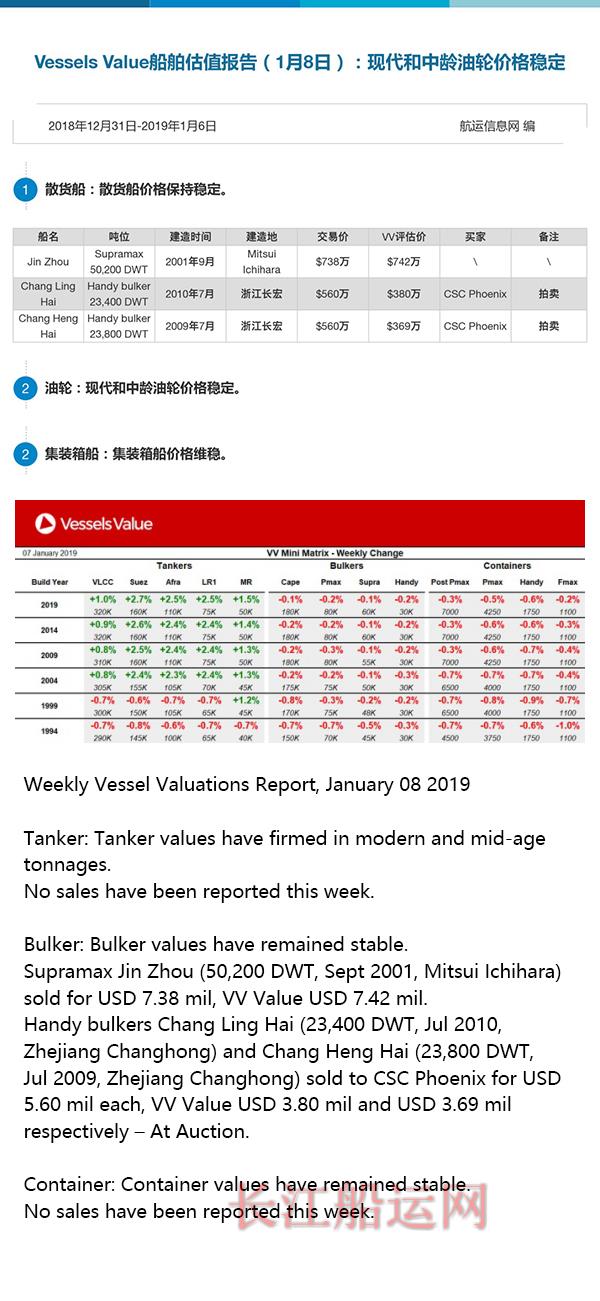 Vessels Value船舶估值报告(1月8日): 现代和中龄油轮价格稳定