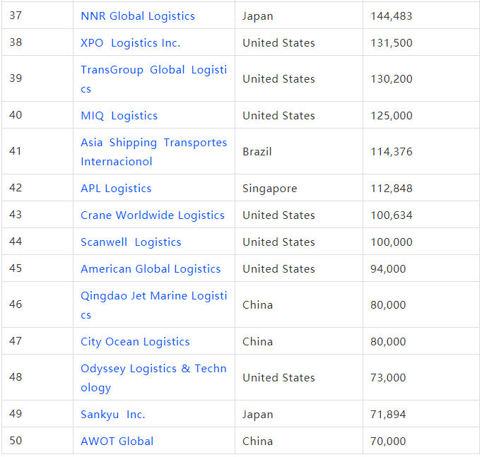物流业权威杂志《Transport Topics》公布了2018全球货代50强榜单!瑞士的德迅公司以年处理箱量435.5万TEU排行第一;德国DHL以年处理箱量325.9万TEU紧随其后。在这份名单里有9家中国货代企业进入榜单, 中外运集运紧随德迅和DHL,稳居全球第三,货量从2017年的280万TEU上升至18年295万TEU。